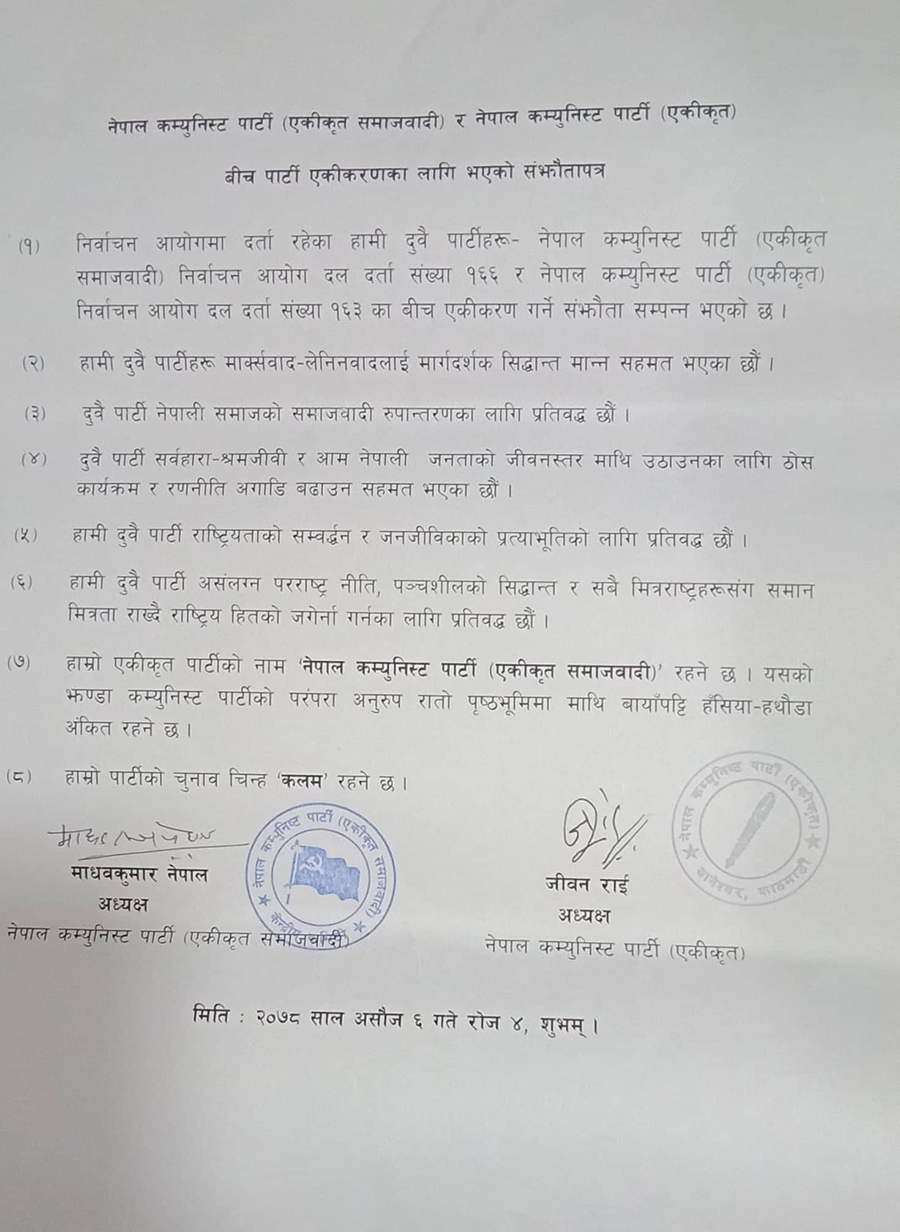 २२ असोज, काठमाडौं । नेकपा (एकीकृत समाजवादी) र नेकपा (एकीकृत) बीच आठबुँदे सहमति गरी पार्टी एकता भएको छ ।