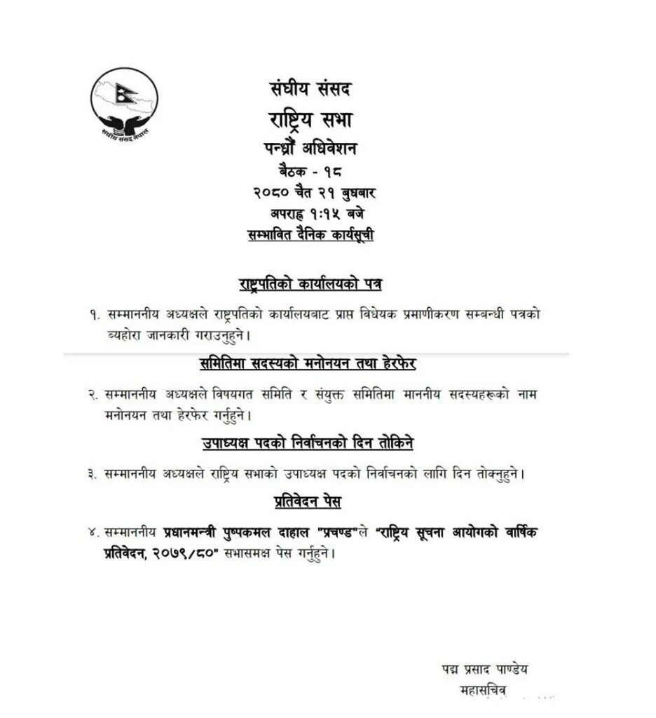 यस्तै सोही विधेयकलाई पारित गरियोस् भनेर पनि प्रस्ताव प्रस्तुत गर्ने कार्यसूची रहेको संसद् सचिवालयले जानकारी दिएको छ ।