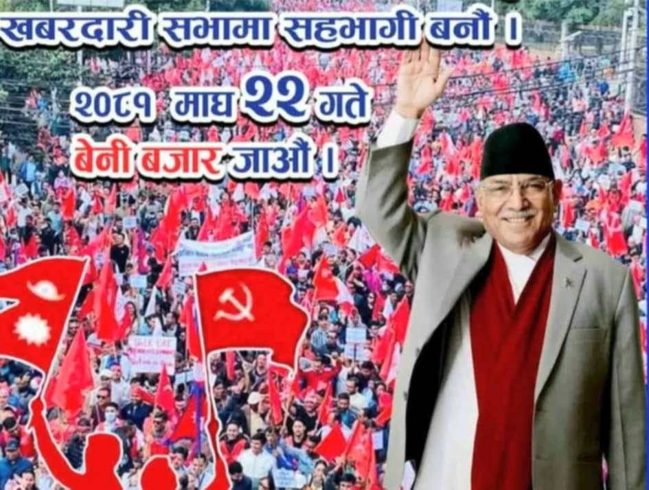 बेनी। नेकपा (माओवादी केन्द्र) का अध्यक्ष तथा पूर्वप्रधानमन्त्री पुष्पकमल दाहाल (प्रचण्ड) भोली माघ २२ गते बेनीमा आउने भएका छन् । नेकपा (माओवादी केन्द्र) म्याग्दीले बेनीमा आयोजना गरेको खवरदारी सभालाई सम्बोधन गर्नका लागि प्रचण्ड बेनीमा आउनेने कार्यक्रम तय भएको जिल्ला संयोजक सेरबहादुर केसीले बताए।