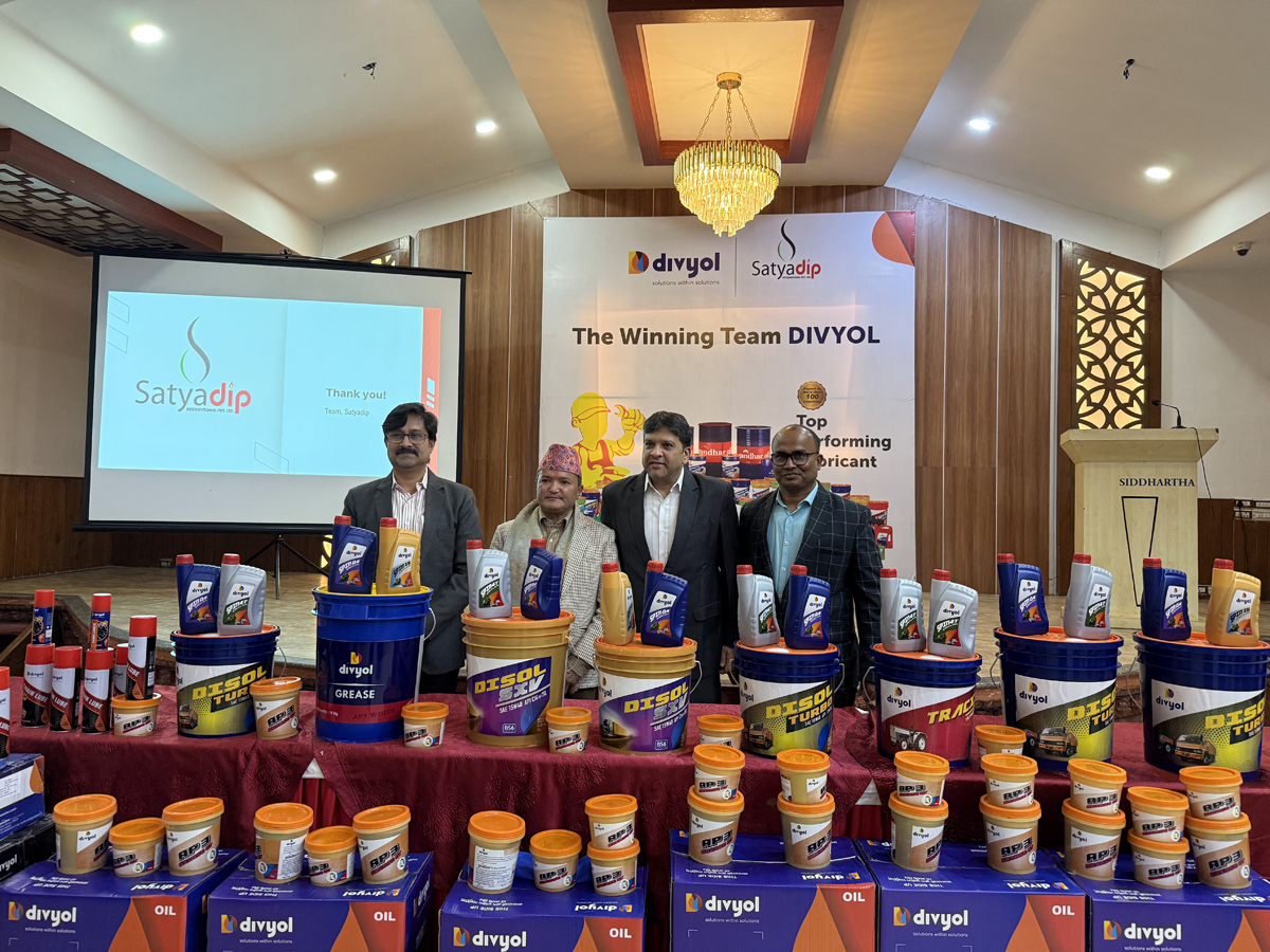 काठमाडौं । दिब्योल लुब्रिकेन्ट्सको नेपालका लागि आधिकारिक विक्रेता सत्यदिप इन्टरनेसनलले ‘मिट एन्ड ग्रिट’ कार्यक्रम सम्पन्न गरेको छ । सो अवसरमा दिब्योल लुब्रिकेन्ट्स नेपालमै उत्पादन थाल्ने घोषणा समेत गरियो । दिब्योल लुब्रिकेन्ट्सको उत्पादक कम्पनी गान्धार आयल रिफाइनरी (इन्डिया) लिमिटेड र सत्यदिप ग्रुपले सो घोषणा गरेका हुन् । सोमबार ललितपुरमा आयोजना गरिएको उक्त कार्यक्रममा दिब्योल लुब्रिकेन्ट्सका तर्फबाट प्रबन्ध निर्देशक समिर पारेख, सेल्स हेड सिल्भानस परमार, नेपाल अटो मेकानिक्स व्यवसायी संघका निवर्तमान अध्यक्ष ठाकुर प्रसाद न्यौपाने र सत्यदिप इन्टरनेसनलका प्रबन्ध निर्देशक दिपेन्द्र कुमार मिश्र लगायतको उपस्थिति रहेको थियो ।