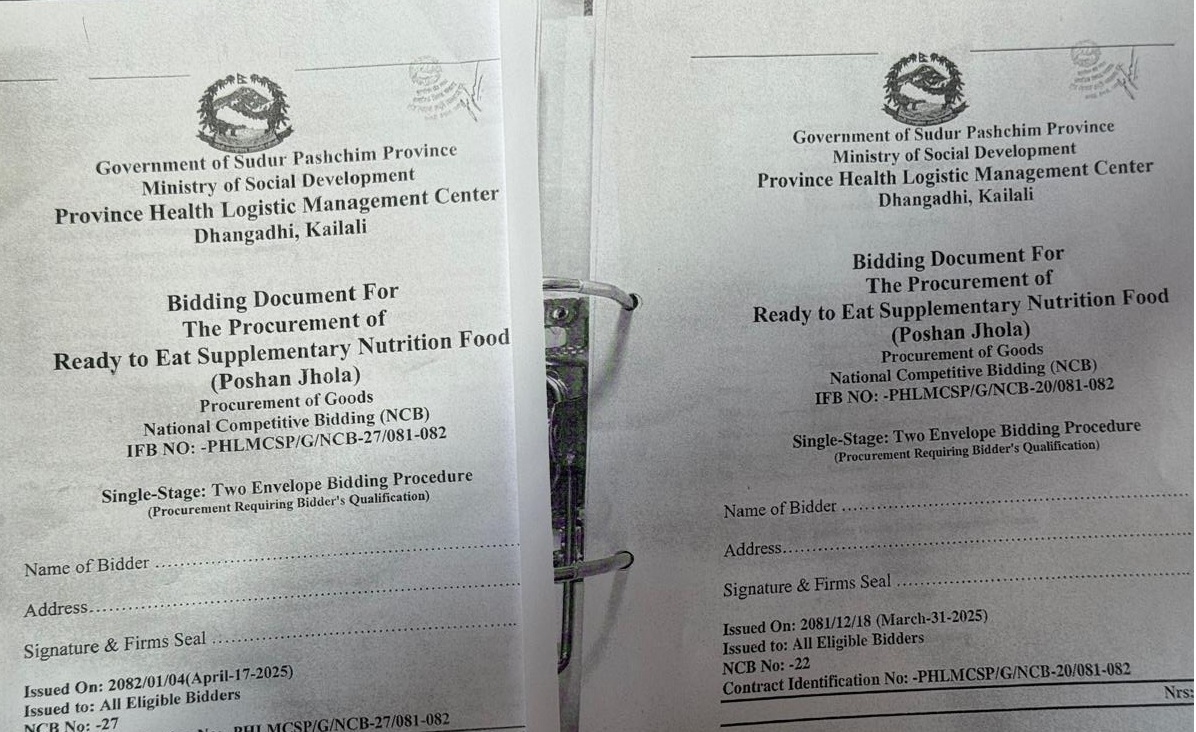 कैलाली । निश्चित व्यापारिक घरानासँगको मिलेमतोमा सुदुरपश्चिमको सामाजिक विकास मन्त्रालयअन्तरगतको प्रादेशिक स्वास्थ्य आपूर्ति व्यवस्थापन केन्द्र, धनगढीले पोषण झोलाको ठेक्कामा अनियमितताको प्रयास गरेको भेटिएको छ ।