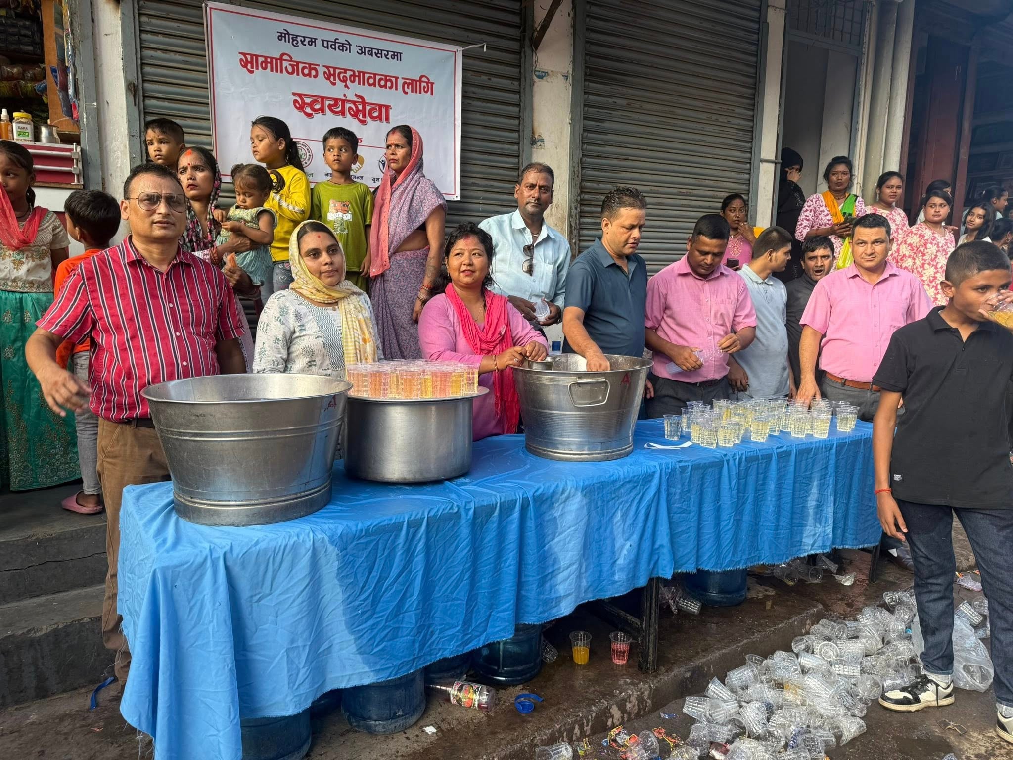 मोहरम पर्व बिशेष सामाजिक सद्भावकालागि नेपालगन्जमा स्वयम्सेवा मुस्लिम धर्मावम्बिहरुको महान पर्व मोहरमको अवसरमा आज नेपालगन्जमा सर्वतपानी वितरण गरिएको छ । मोहरम पर्वको अवसरमा सामाजिक सद्भावका लागि स्वयम्सेवा अन्तरगत नेपालगन्जको त्रीबेणीमोडमा सर्वतपानी वितरण गरिएको हो । बास नेपाल, नाइस नेपालगन्ज र युथ एड्भोकेसी नेपालले संयुक्त रुपमा सर्वतपानी वितरण कार्यक्रमको आयोजना गरेको हो ।