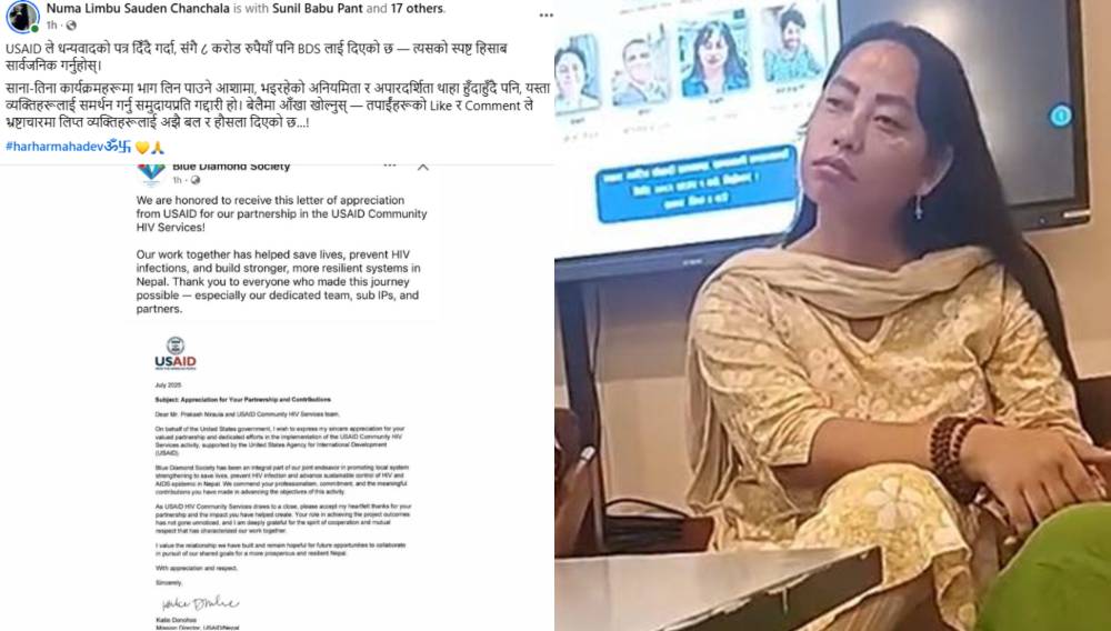सामाजिक सञ्जालमा उनले यसअघि लेखेकी थिइन्, “युएसएआइडीको पेफार कार्यक्रम बन्द भएपछि एमएसएम–टिजी लक्षित एचआइभी परियोजनाको बाँकी ८ करोड ब्लु डायमन्डलाई छोडिएको थियो, तर त्यसको खर्च विवरण अस्पष्ट छ। हामी सबैले माग गर्नुपर्छ, यो रकमको प्रयोगबारे पूर्ण पारदर्शिता होस्। यो सार्वजनिक स्वास्थ्य र कमजोर समुदायको हितका लागि छुट्टाइएको हो, व्यक्तिगत वा संस्थागत स्वार्थका लागि होइन।”