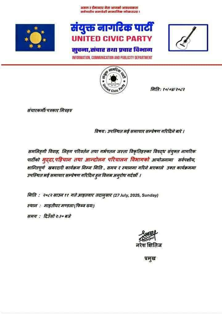 काठमाडौं , संयुक्त नागरिक पार्टीद्वारा सार्वजनिक गरिएको कार्यक्रमको सूचना पत्रमा ‘समलिङ्गी विवाह, लिङ्ग परिवर्तन तथा गर्भपतन जस्ता विकृति’ भन्ने अभिव्यक्ति समेटिएपछि त्यसप्रति लैङ्गिक तथा यौनिक अल्पसङ्ख्यकको संस्था ‘मायाको पहिचान नेपाल’ले गम्भीर आपत्ति जनाएको छ।