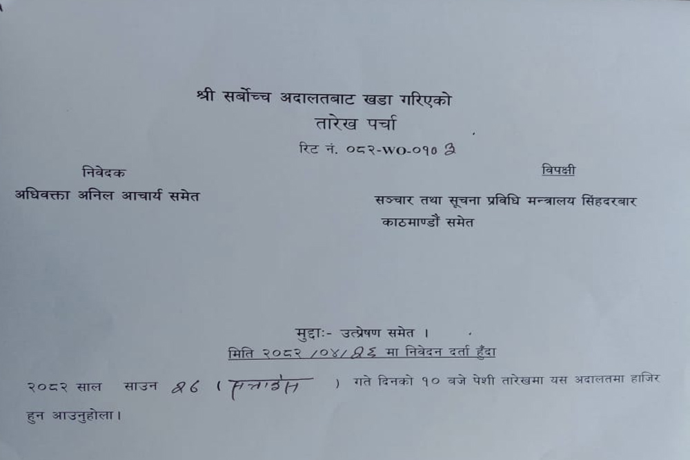 काठमाडौं । अनलाइन सञ्चारमाध्यम दर्ता तथा नविकरण जिल्ला प्रशासन कार्यालयमार्फत मात्र गर्नुपर्ने व्यवस्था र त्यसकै आधारमा सूचना तथा प्रसारण विभागले गरेको निर्णयविरुद्ध सर्वोच्च अदालतमा रिट २०८२ साउन २६ गते दायर मुद्दाको भोली सुनुवाइका लागि २७ मा पेसी तोकिएको छ।