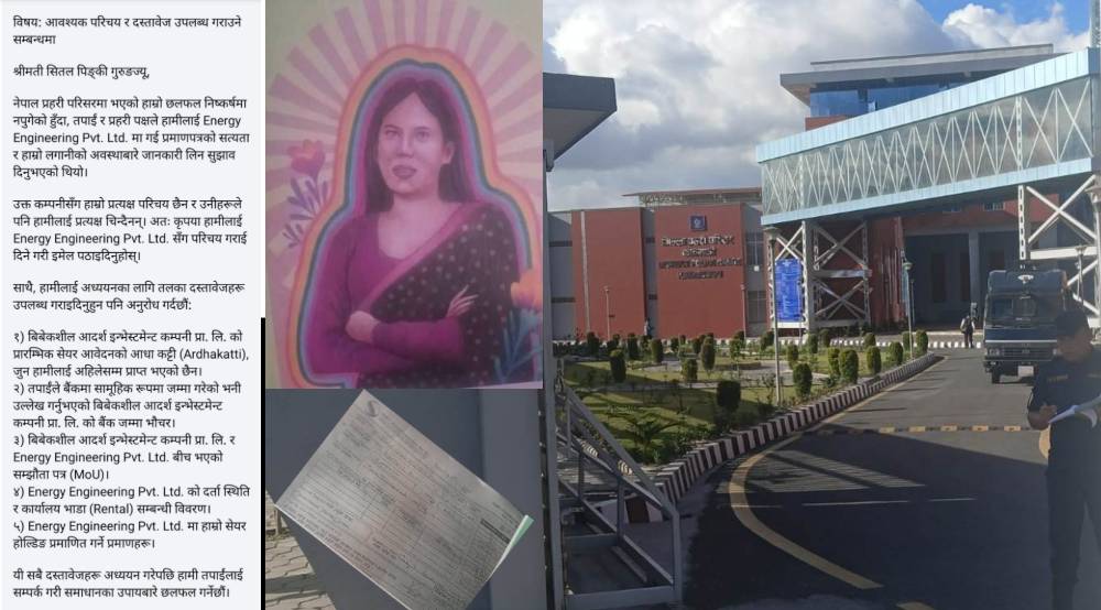 पीडितहरूले पत्रमा भनेका छन्—प्रहरी र पिँकी दुवै पक्षले Energy Engineering Pvt. Ltd. मा गई प्रमाणपत्रको सत्यता र लगानीको अवस्था बुझ्न सुझाव दिएको भए पनि उक्त कम्पनीसँग पीडितहरूको प्रत्यक्ष परिचय नभएको र कम्पनीले पनि उनीहरूलाई चिन्न नसक्ने भएकाले पिँकीले आधिकारिक रूपमा परिचय गराइदिने व्यवस्था मिलाउनुपर्छ।