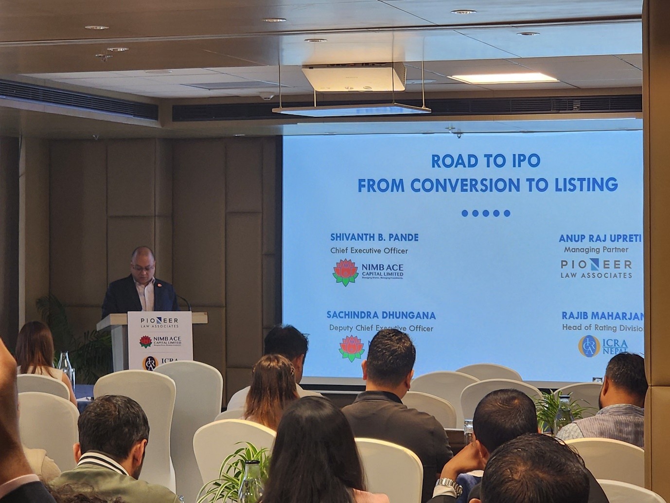 NIMB Ace Capital Limited र Pioneer Law Associates / ICRA Nepal Limited सँगको सहकार्यमा २९ अगस्त २०२५ मा Hotel Aloft Kathmandu df “Road to IPO” नामक कार्यशालामा सफलतापूर्वक आयोजना गरेको थियो । उक्त कार्यक्रममा विशेष गरि कर्पोरेट संथाका सहभागीहरुलाई प्राथमिक सार्वजनिक निष्काशन (Initial Public Offering) को प्रकृया मार्फत आफ्ना कम्पनीलाई सूचिकृत गर्नका लागि आवश्यक प्रक्रियागत जानकारी र रणनीतिक मागएदर्शन प्रदान गर्ने उद्देश्यले आयोजना गरिएको थियो ।