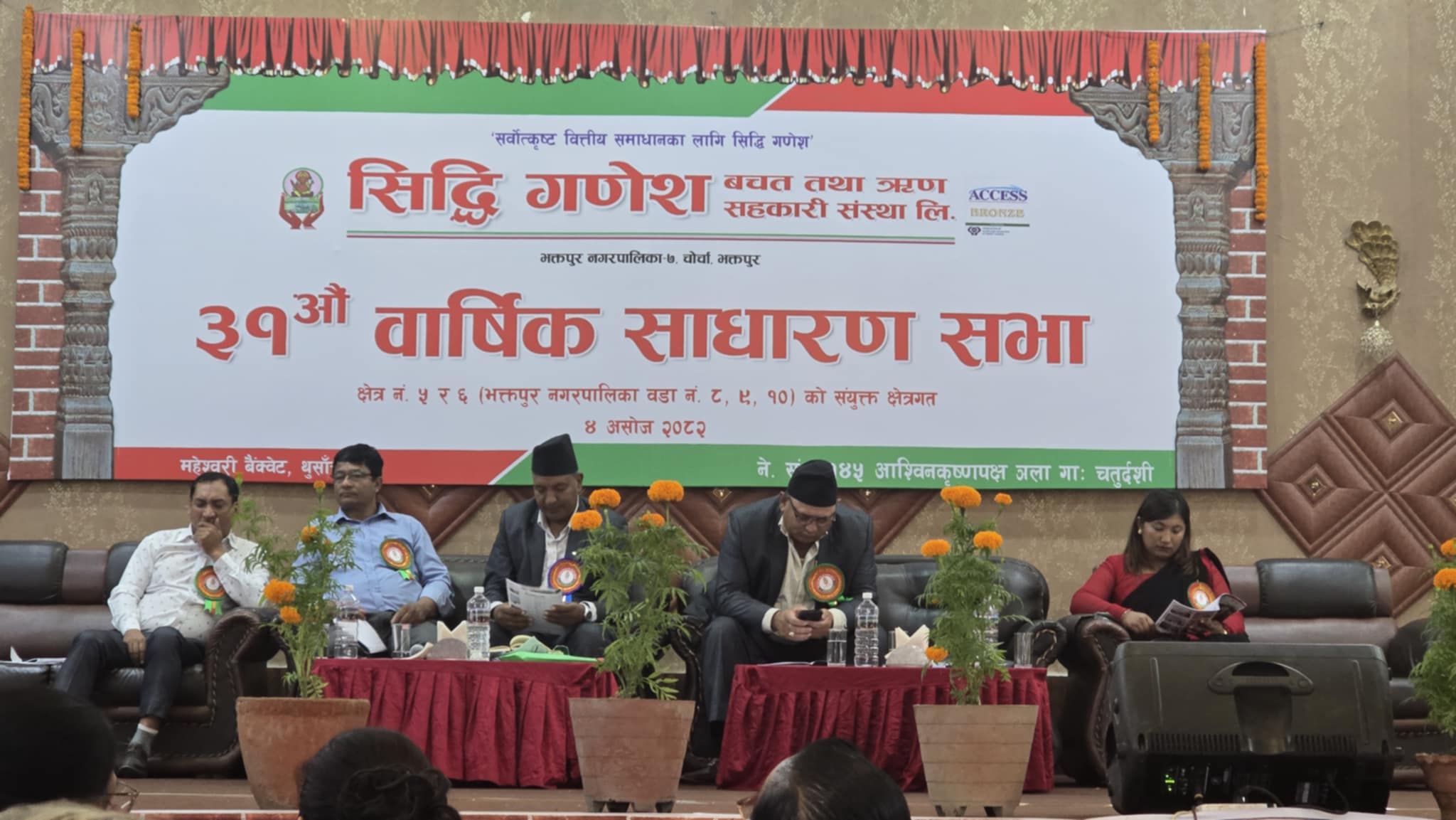 नेपालकै अधिक सदस्य रहेको संस्थाको रुपमा रहेको सिद्धि गणेश बचत तथा ऋण सहकारी संस्थाले पहिलो पटक संस्थाबाहेकका अन्य व्यक्तिलाई अतिथि नबनाइकन साधारणसभा गरेको छ । १७ हजार ८ सय सदस्य रहेको भक्तपुरको सिद्धि गणेशले अजिमा पार्टी महल, स्टार बैंक्वेट र महेश्वरी बैंक्वेटमा गरी ३ ठाउँमा एकै दिन एकै समयमा शनिवार क्षेत्रगत रुपमा साधारणसभा गरेको हो ।