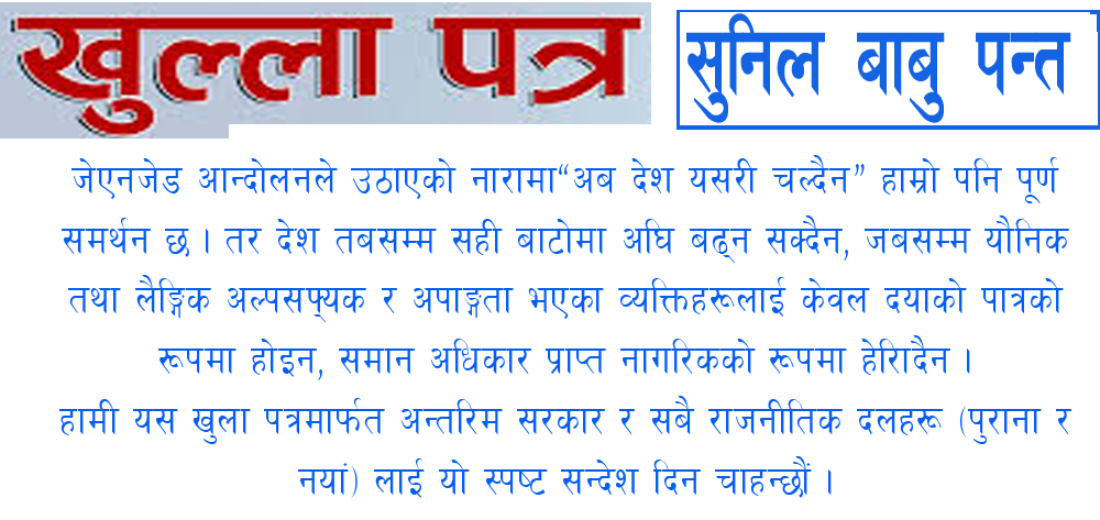 जेएनजेड आन्दोलनले उठाएको नारामा—“अब देश यसरी चल्दैन”—हाम्रो पनि पूर्ण समर्थन छ। तर देश तबसम्म सही बाटोमा अघि बढ्न सक्दैन, जबसम्म यौनिक तथा लैङ्गिक अल्पसङ्ख्यक र अपाङ्गता भएका व्यक्तिहरूलाई केवल दयाको पात्रको रूपमा होइन, समान अधिकार प्राप्त नागरिकको रूपमा हेरिँदैन।