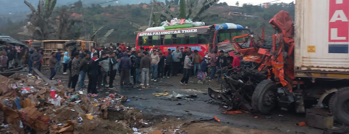 एउटा स्कुल बस, तीनवटा यात्रुवाहक बस, डिब्बा गाडी, ट्रक र मोटरसाइकल गरी ६ वटा सवारी साधन एक आपसमा ठोक्किएका हुन् ।