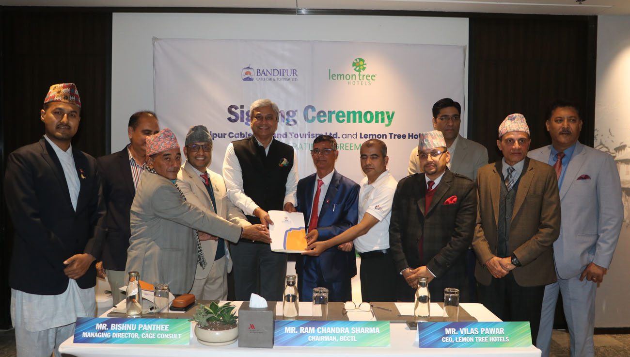 बन्दीपुर केवलकार एण्ड टुरिजम लिमिटेड र भारतको अग्रणी तथा अन्तर्राष्ट्रिय स्तरमा स्थापित होटल शृङ्खला लेमन ट्री होटल्स लिमिटेडबीच होटल सञ्चालनको लागि १५ वर्षे फ्रेन्चाइजी तथा व्यवस्थापन सम्झौता सम्पन्न भएको छ । बन्दीपुर केवलकार एण्ड टुरिजम लिमिटेडको तर्फबाट इन्जिनियर श्री विष्णु पन्थी र लेमन ट्री होटल्स लिमिटेडको तर्फबाट मुख्य कार्यकारी अधिकृत (CEO श्री विलास पवारले आज काठमाण्डौंमा एक समारोह बीच सम्झौतामा हस्ताक्षर गर्नुभयो ।