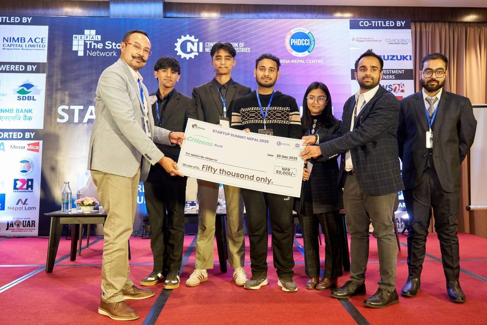 काठमाडौं । नेपाल इन्जिनियरिङ कलेजका विद्यार्थीहरु ‘द स्टार्टअप समिट नेपाल २०२५’को विजेता भएका छन् । कलेजका कम्प्युटर इन्जिनियरिङ सातौं सेमेस्टरका विद्यार्थीहरु आनन्द रिमाल, सुलभ तिमलसिना, आदित्य मल्ल ठकुरी तथा दिया शाक्यले स्टार्टअप समिट नेपालको उपाधि जितेका हुन् ।