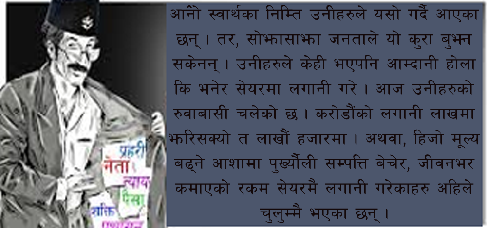 आफ्नो स्वार्थका निम्ति उनीहरुले यसो गर्दै आएका छन् । तर, सोझासाझा जनताले यो कुरा बुझ्न सकेनन् । उनीहरुले केही भएपनि आम्दानी होला कि भनेर सेयरमा लगानी गरे । आज उनीहरुको रुवाबासी चलेको छ । करोडौंको लगानी लाखमा झरिसक्यो त लाखौं हजारमा । अथवा, हिजो मूल्य बढ्ने आशामा पुख्र्यौली सम्पत्ति बेचेर, जीवनभर कमाएको रकम सेयरमै लगानी गरेकाहरु अहिले चुलुम्मै भएका छन् ।