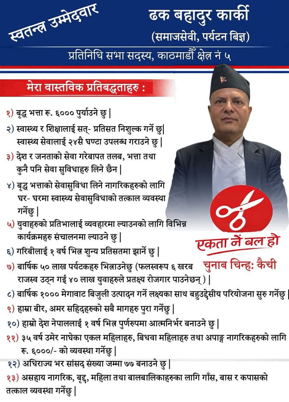 लामोकालदेखि सामाजिक तथा पर्यटन क्षेत्रमा कार्य गदै आएका बौद्धिक व्यक्तित्व ढकबहादुर कार्की (डिबी) कार्की एक असल र विकास प्रेमी व्यक्ति हुन । पछिल्लो चरणमा नेपालमा भएको व्याप्त भ्रष्टाचार र राजनीति अस्थिरताको कारण देशका हरेक क्षेत्रमा बितृष्णा उत्पन्न भएको बेला आउँदो फागुन २१ हुने प्रतिनिधिसभा निर्वाचनमा काठमाडौं क्षेत्र नम्बर ५ बाट उम्मेदवारी दिनु भएकाले उहाँसँग यसै बिषयमा समर रोकायाले लिएका बिचारहरु मतदाता तथा समग्र नागरिक समक्ष राख्दछौं ।